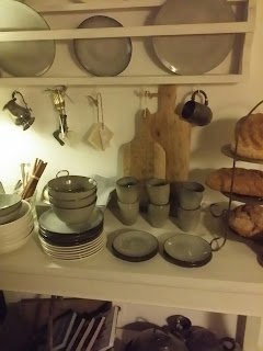 Op de biedermeiertafel staan twee dennenappels die met een heerlijk ruikende, héél lichtgroene was zijn overgoten. Waarschijnlijk bedoeld voor in een openhaard, maar aangezien die van ons op gas gaat, is dat hier niet zo verstandig:-)